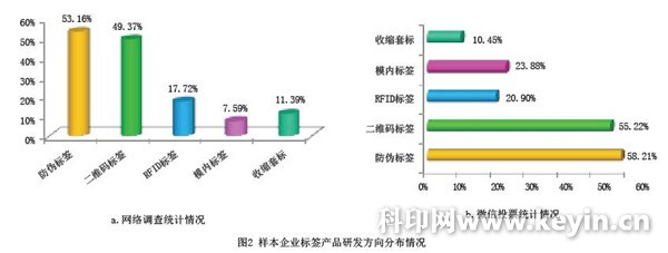 工藝技術創(chuàng)新在產(chǎn)品上的體現(xiàn),則主要集中于防偽標簽、溯源和物流追溯標簽、個性化促銷標簽等產(chǎn)品領域。網(wǎng)絡調(diào)查反饋情況是:53.16%的樣本企業(yè)將主要研發(fā)方向定位于防偽標簽,49.37%的樣本企業(yè)將可變信息二維碼標簽作為主要研發(fā)方向,17.72%的樣本企業(yè)將研發(fā)RFID標簽作為2016年的重點,7.59%的樣本企業(yè)在開發(fā)模內(nèi)標簽,11.39%的樣本企業(yè)則在收縮套標領域深耕,見圖2-a。而微信投票的統(tǒng)計結果則如圖2-b所示,其中研發(fā)模內(nèi)標簽的占比較之網(wǎng)絡調(diào)查結果更突出。