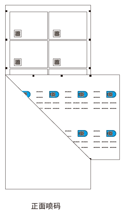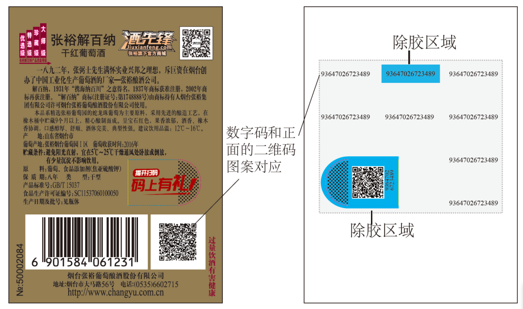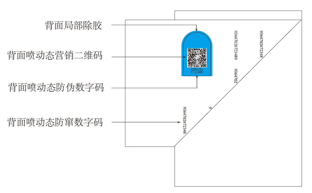 從圖中可以看到,標(biāo)簽的正面噴印追溯二維碼,防偽數(shù)字碼和背面除膠區(qū)域噴印,其他背面區(qū)域噴印防竄數(shù)字碼,正面局部做了撕拉口設(shè)計(jì)。