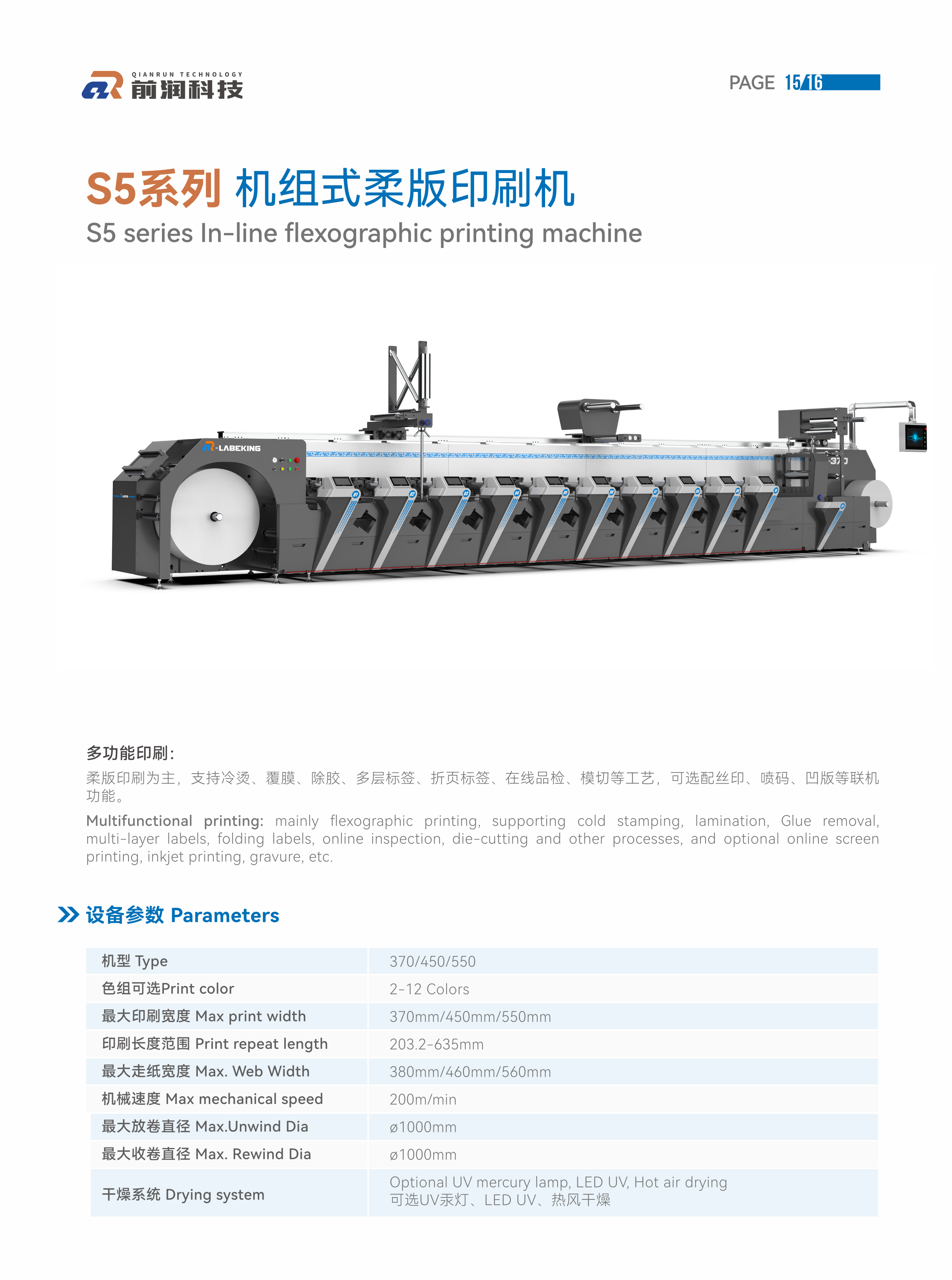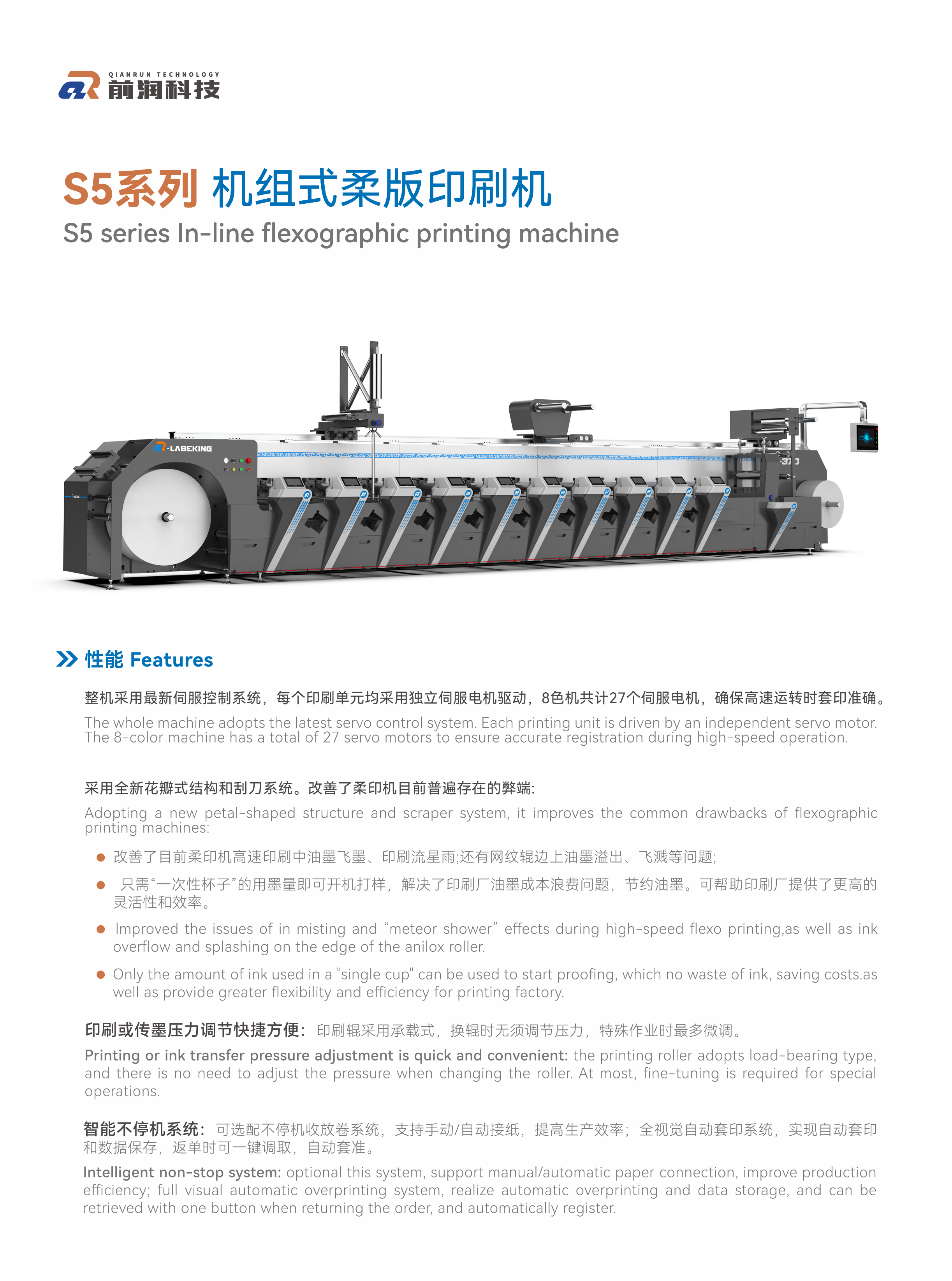 5??多功能印刷: 柔版印刷為主,支持冷燙、覆膜、除膠、多層標(biāo)簽、折頁標(biāo)簽、在線品檢、模切等工藝,可選配絲印、噴碼、凹版等聯(lián)機(jī)功能。
