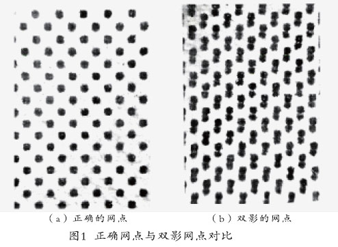 當(dāng)通過100倍的放大鏡或顯微鏡觀察印品時(shí),印刷品上15%~25%網(wǎng)點(diǎn)區(qū)域會(huì)顯示出明顯的雙影問題。其表現(xiàn)是,在一個(gè)深色點(diǎn)子旁邊出現(xiàn)一個(gè)淺色點(diǎn)子或者是深色點(diǎn)子與淺色點(diǎn)子相互搭疊(見圖1)。其發(fā)生機(jī)理可以這樣解釋:由于油墨圖文從橡皮滾筒轉(zhuǎn)移到紙張上的過程中未能完全轉(zhuǎn)移,在橡皮布上留下了一個(gè)淺色的可印刷圖像。在下一印刷周期中,印版上轉(zhuǎn)移過來的新鮮的油墨圖像未能與橡皮布上殘留的圖像精確對(duì)準(zhǔn),轉(zhuǎn)移到下一張紙上的圖像就會(huì)形成雙影。這是網(wǎng)目調(diào)印刷的一個(gè)令人煩惱的問題。因?yàn)槊恳挥埳系碾p影情況都不相同,從而導(dǎo)致色彩濃淡無規(guī)律的變化。